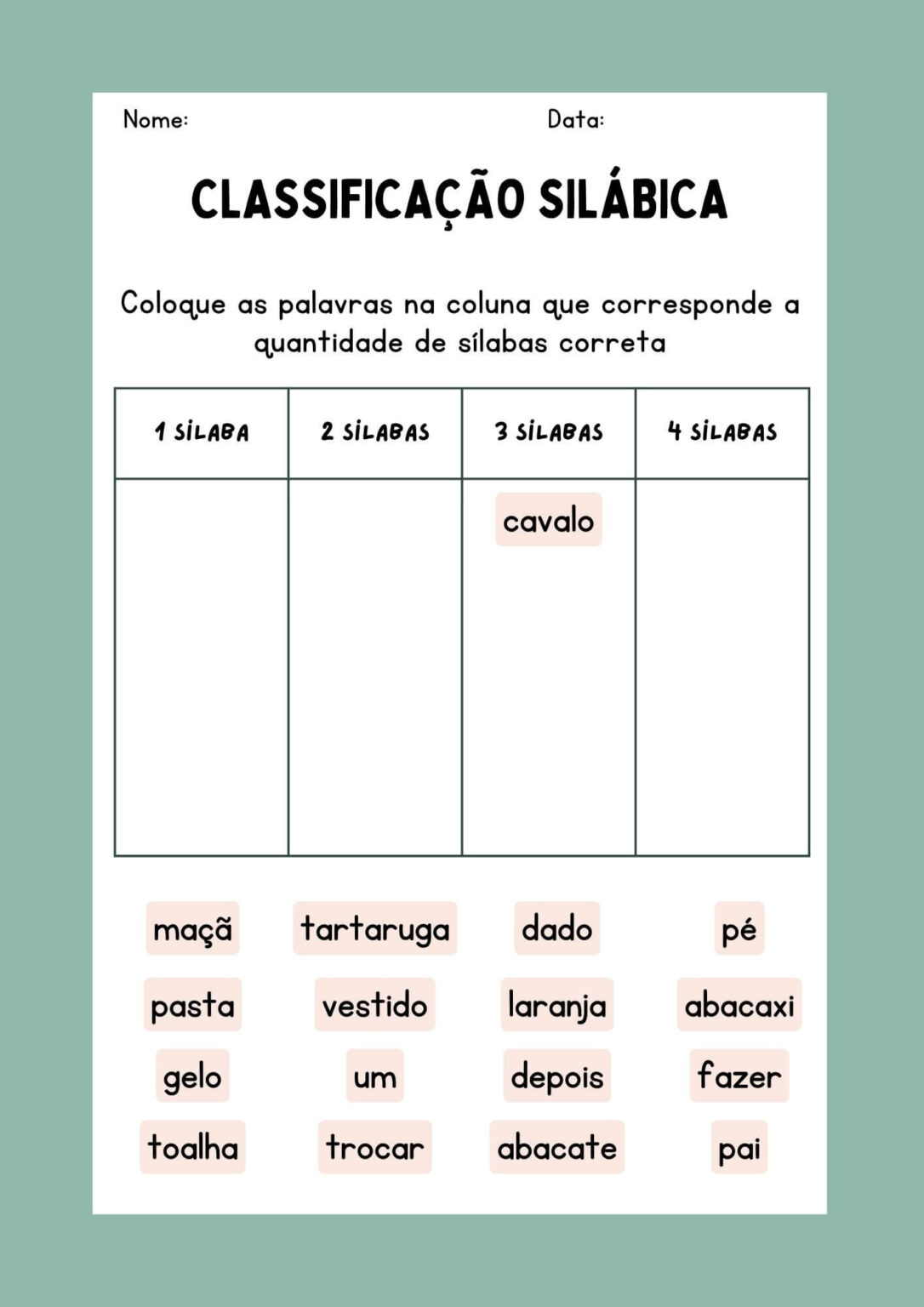 As atividades de separação de sílabas e classificação de palavras pelo ritmo também podem ser realizados em casa, com o apoio dos pais. Criar jogos com cartas, ler livros em voz alta e separar as palavras por sílabas, ou mesmo cantar músicas e identificar os versos, são maneiras simples e eficazes de auxiliar no processo de aprendizado.