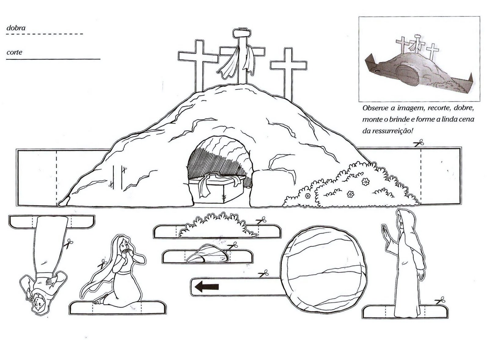 Uma atividade interessante pode envolver a confecção de um cenário com a história da Ressurreição. As crianças podem participar criando os personagens (Jesus, as mulheres, os soldados) com massa de sal, papel cartão ou outros materiais reciclados. Esta atividade oferece a oportunidade de discutir a história de maneira prática e visual.