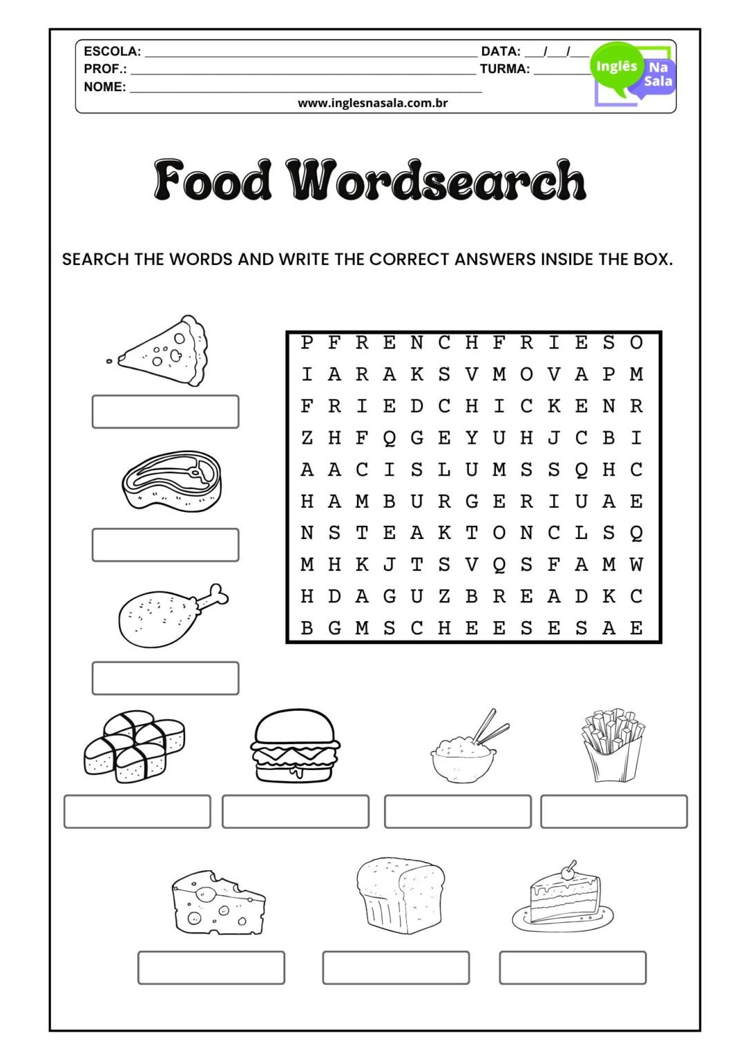 aprender inglês de forma divertida e interativa nunca foi tão fácil! As atividades sobre alimentos são uma ferramenta incrível para ampliar o vocabulário de crianças e adultos, explorando temas cotidianos e despertando o interesse pelo idioma. E o melhor: você pode imprimir essas atividades e utilizá-las em qualquer lugar, sem depender de recursos online.