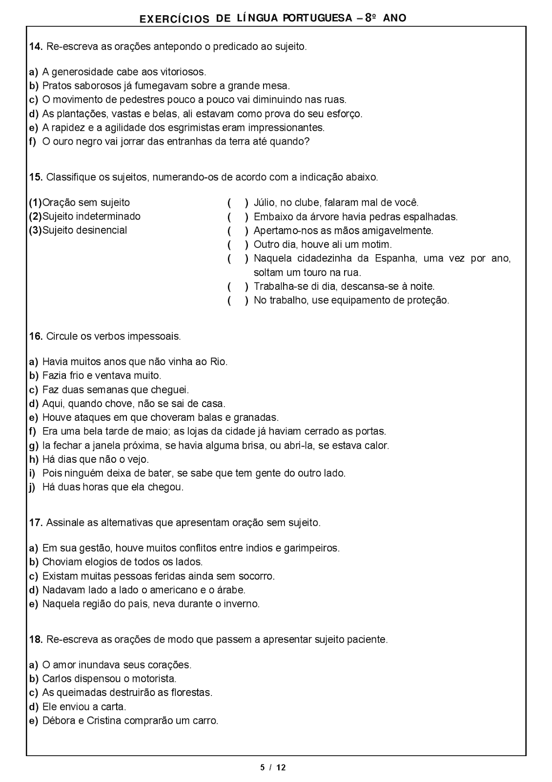 Atividade Com Gabarito Sujeito E Predicado