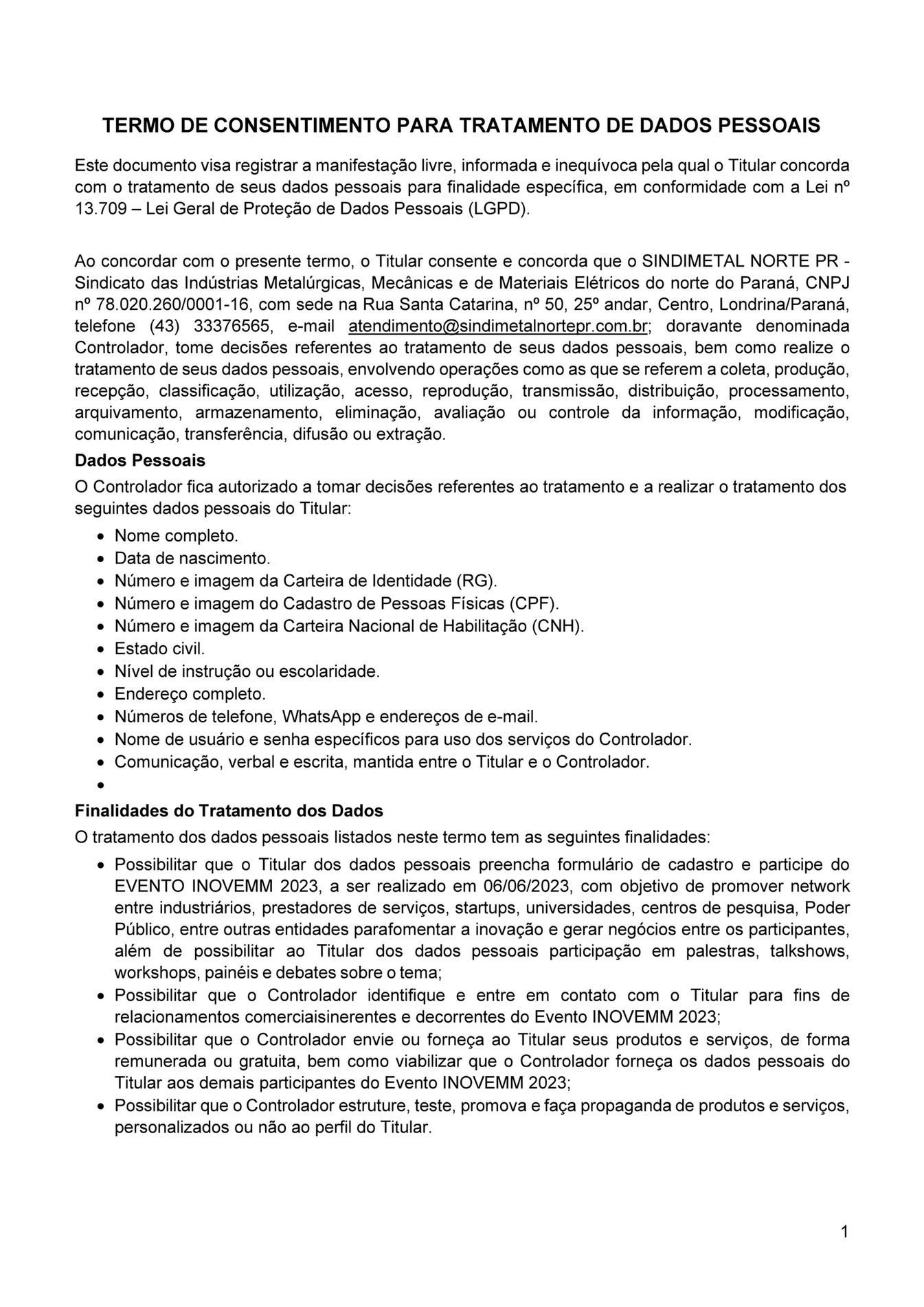 Sindimetal Norte do Paraná - TERMO DE CONSENTIMENTO PARA TRATAMENTO DE
